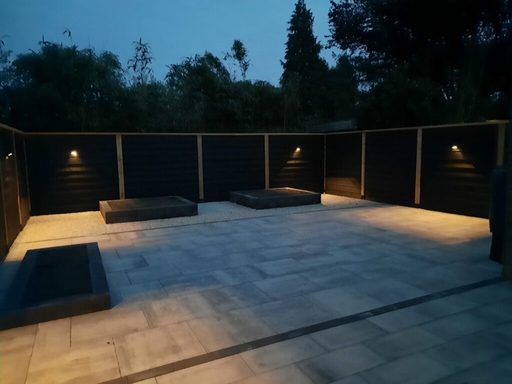Rooien en afvoeren aanwezige beplanting / Afvoeren aanwezige bestrating / Plaatsen van Douglas schutting / Leveren en aanbrengen In-Lite Dark Wedge verlichting op de schutting / Leveren en aanbrengen nieuwe bestrating / Leveren en aanbrengen van verhoogde borders d.m.v. stapelblokken / Inplanten en afwerken van de tuin