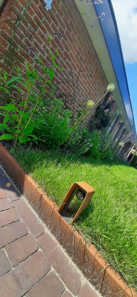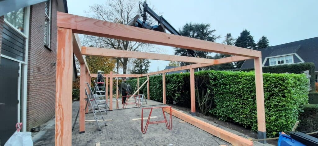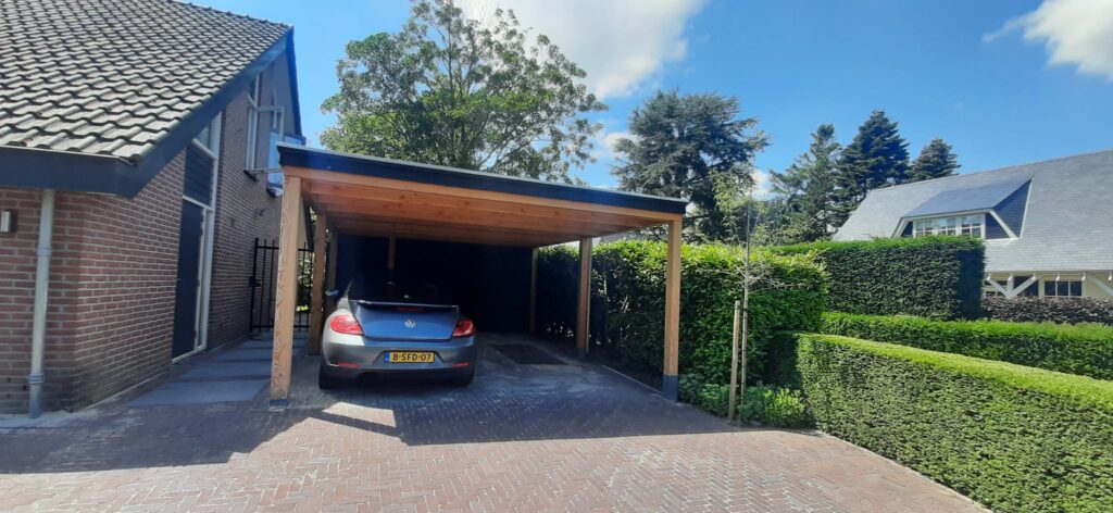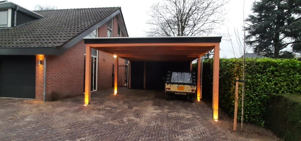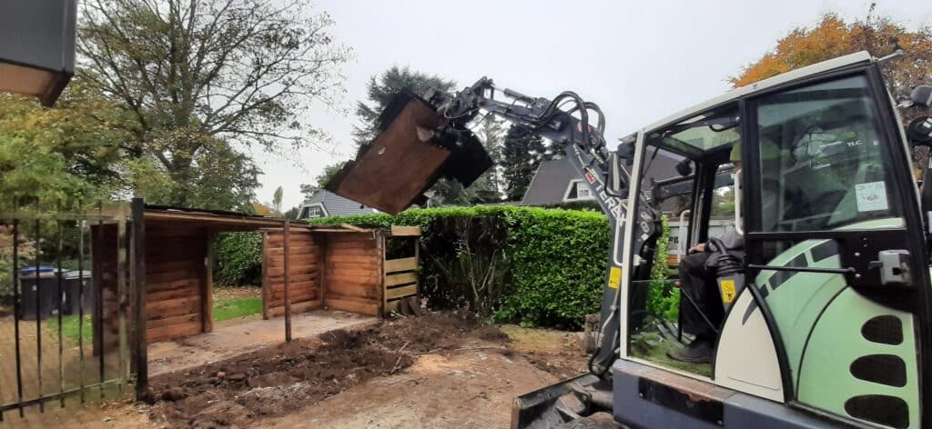 Slopen aanwezige schuur / Rooien en afvoeren aanwezige beplanting (behalve hergebruik) / Afvoeren aanwezige bestrating / Uitvoeren grondwerk / Aanbrengen carport met schuurgedeelte / Aanbrengen van gebakken dikformaat in combinatie met Oudhollands 100×100 tegels / Aanbrengen graszoden / Aanbrengen verlichting In-Lite / Aanbrengen div. beplanting volgens plan